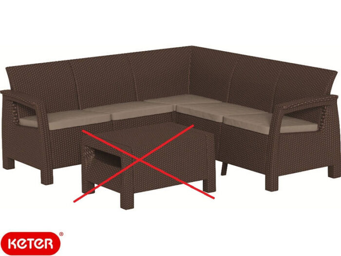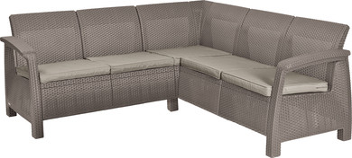 Угловой диван серии Corfu выполнен из полипропилена с мягкими подушками. Текстура поверхности напоминает ротанговое плетение. Материал устойчив к неблагоприятным погодным условиям. Детали цельные, обеспечивают быструю и легкую сборку.