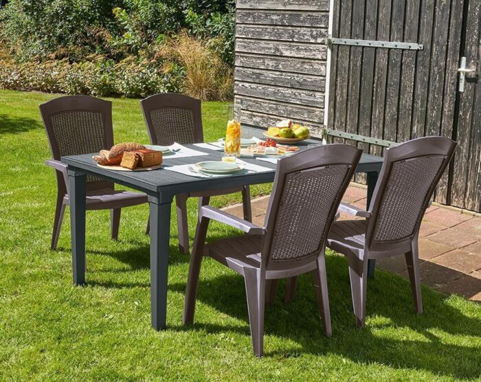 Спинка эргономичной формы, слегка расширяющейся вверху, имеет вставку, напоминающую ротанговое переплетение. Стул легко чистится и не требует особо ухода. Благодаря свойствам полипропилена стул устойчив к неблагоприятным погодным условиям и УФ-лучам, а также мало весит.